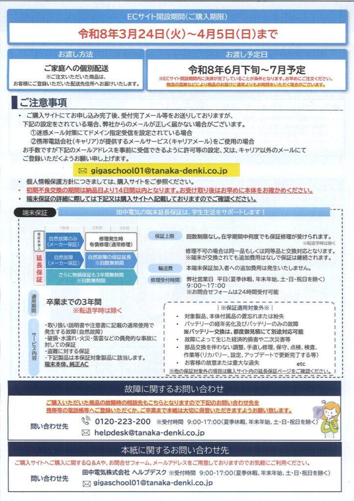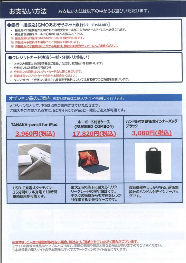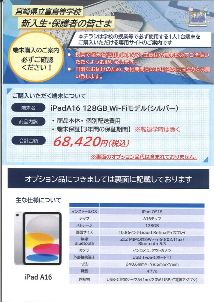 iPadで特に問題ない方で学校(業者)に任せますという方は、学校指定の業者さんを紹介します。保証付き付属品(選択可)付きでまとめて購入していただけます。案内文書は合格者登校日で配布ですが、ここにも掲載しておきます。なお、iPadは11世代(A16チップの最新版)です。